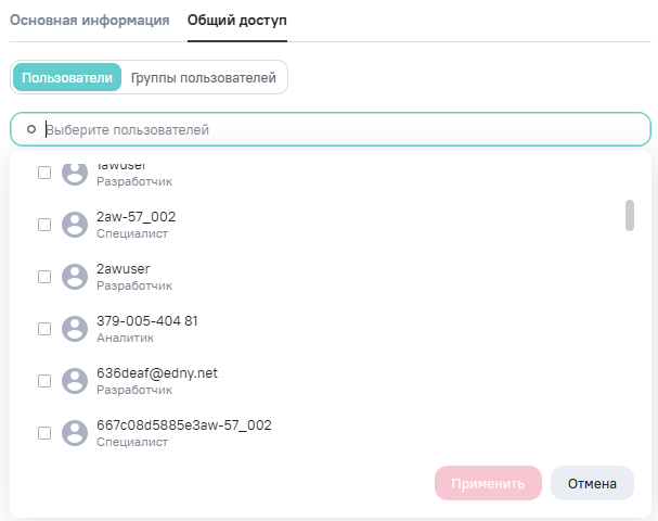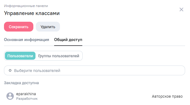 Пользователю на вкладке Общий доступ в окне редактирования закладки доступно изменение прав доступа к закладке пользователю или группе пользователей.