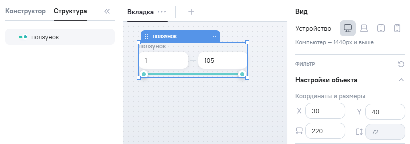 • выбор виджета - доступно при нажатии на виджет на вкладке Структура. По нажатию на виджет в списке, на рабочей области панели устанавливается фокус на виджет: виджет выделен синей обводкой, в блоке Вид доступны настройки виджета.