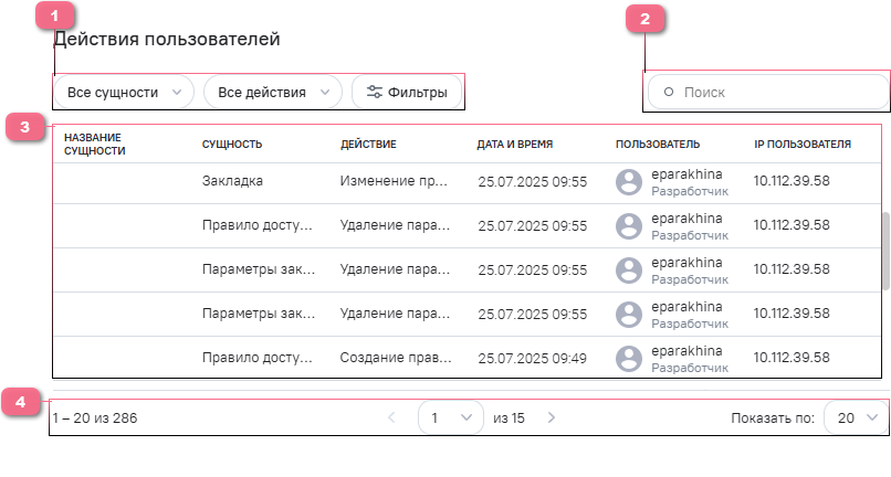 В окне Настройки перейдите в раздел Действия пользователей. При наличии истории изменений отобразится реестр объектов, который содержит следующие элементы интерфейса: