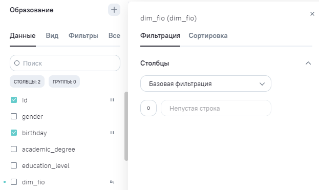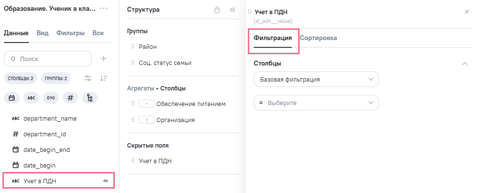 При нажатии кнопки поле не будет отображаться как столбец в данных виджета, а будет использоваться только для выполнения фильтрации данных. Настройка фильтрации выполняется в отдельном окне, на вкладке Фильтрация. Окно открывается при нажатии на кнопку