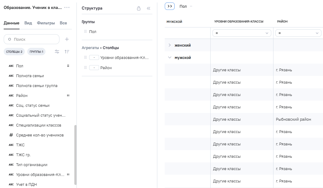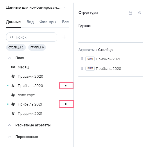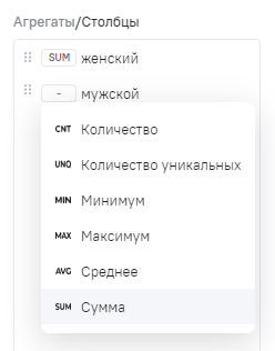- настраивать агрегацию для полей выбранных в Агрегаты/Столбцы нажав на кнопку агрегации слева от наименования поля. При нажатии откроется список доступных агрегаций, который зависит от типа поля;