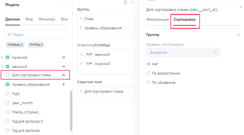 При нажатии кнопки поле не будет отображаться как столбец в данных виджета, а будет использоваться только для выполнения сортировки данных группировок. Настройка сортировки выполняется в отдельном окне, на вкладке Сортировка. Окно открывается при нажатии на кнопку