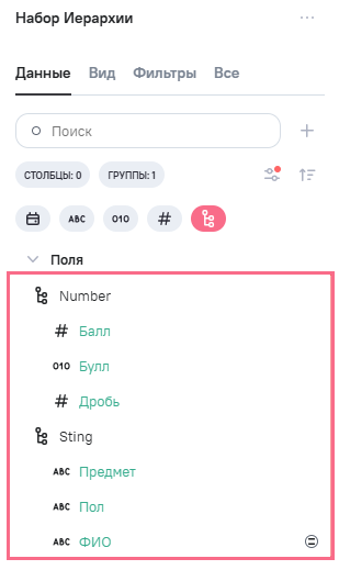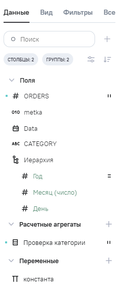 Иерархию можно переместить между другими сгруппированными полями. Поля, которые находятся в составе иерархии, не отображаются в хлебных крошках. Поля в составе иерархии можно перемещать местами только внутри самой иерархии, нажав на значок иерархии.