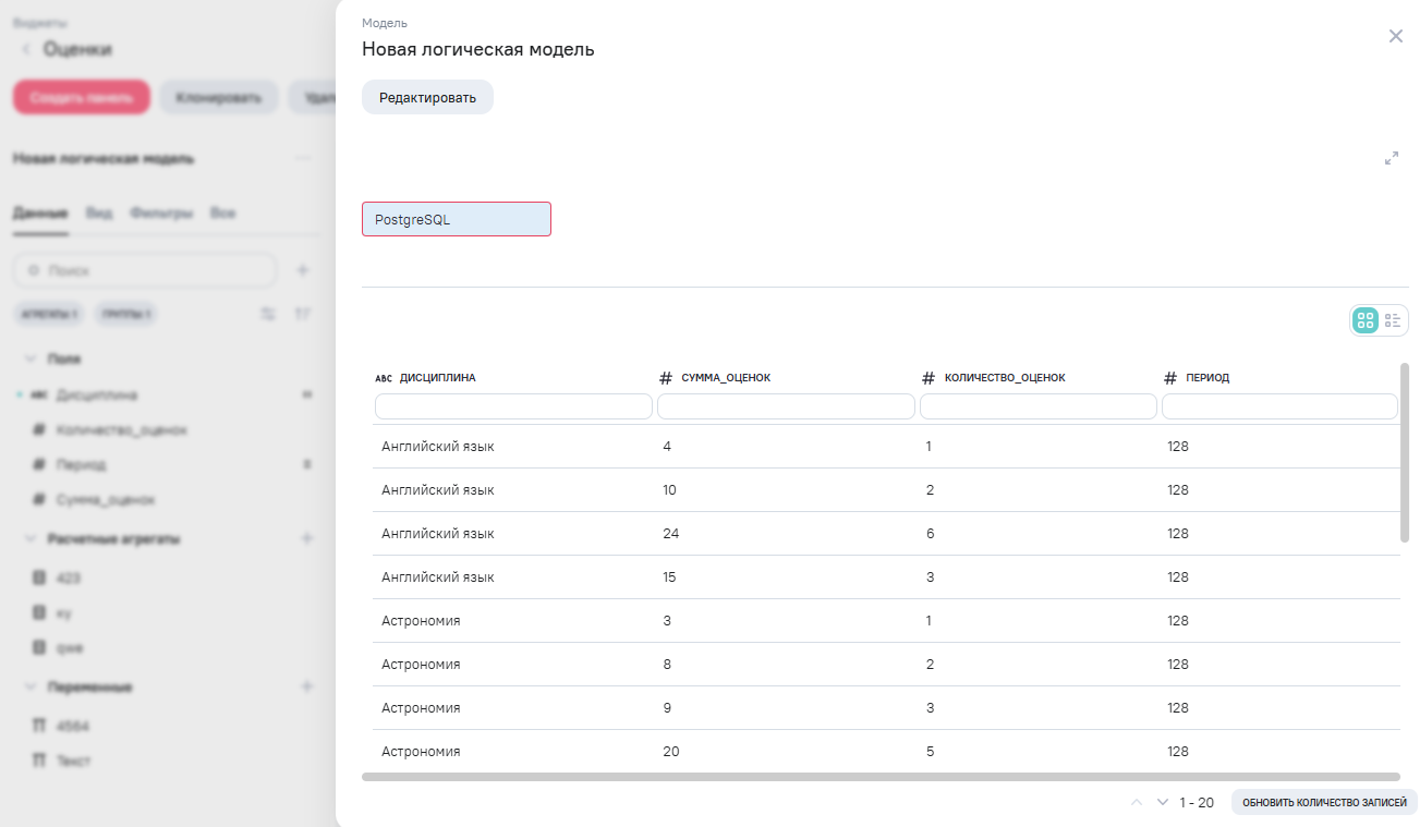 На вкладке Данные выполняются настройки способа обработки и группировки данных используемой модели. Поля модели находятся в раскрытом блоке Поля с возможностью сворачивания списка полей. В блоки Расчетные агрегаты и Переменные можно добавлять новые поля для виджета.
