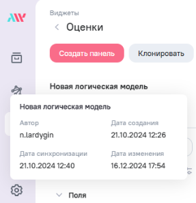 После создания виджета потребуется выбрать модель, а затем необходимые и достаточные для построения виджета поля. Поля модели находятся в раскрытом блоке Поля с возможностью сворачивания списка полей. В списке отображаются только загруженные поля.