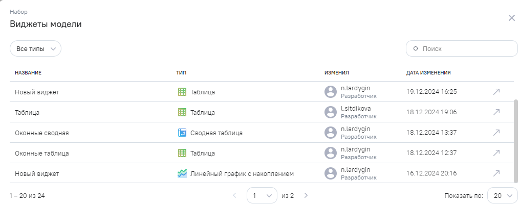 На форме просмотра виджетов модели доступна фильтрация по типу виджета, поиск по названию виджета, а также