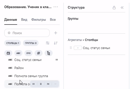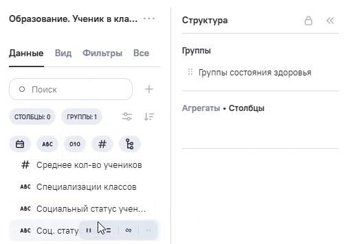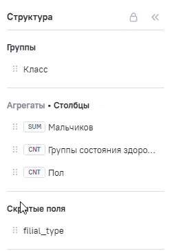 Недоступно перемещение полей между блоками структуры. Например, нельзя переместить поле из Группы в Агрегаты/Столбцы или Скрытые поля.