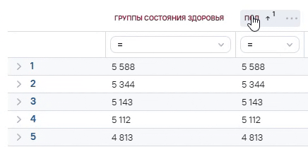 Поле может быть одновременно добавлено и в блок Агрегаты/Столбцы и в блок Группы. При таком способе включения поля в виджет оно отображается в списке с меткой . В этом случае виджете вместе со столбцом сгруппированных полей появится столбец, в котором исходное значение будет повторяться в каждой строке.