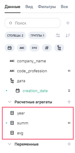 Нажмите на кнопку Добавить. Кнопка активна только после заполнения обязательных полей. Созданные расчетные агрегаты отображаются в блоке Расчетные агрегаты на вкладке Данные.