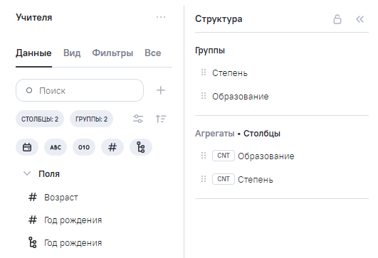 3.Область основных настроек виджета. После изменения ширины для области основных настроек виджета она сохраняется при дальнейшем редактировании для блоков Данные и Структура;