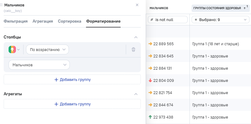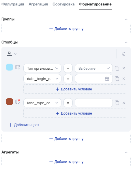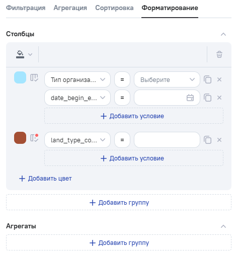 В блоке Столбцы могут указываться условия и на другие поля. К текущему полю, в котором происходит редактирование, будет применено форматирование в зависимости от условий на значения в другом поле. В блоке Агрегаты доступен выбор полей с промежуточной агрегацией.