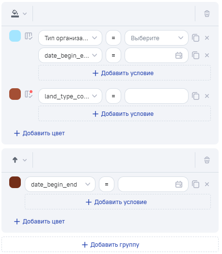 Добавить цвет - при нажатии на кнопку добавляется новая строка подгруппы для указания условий. Кнопка доступна всегда и находится в рамках группы;