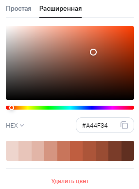 - расширенный - позволяет выбрать цвет из палитры, также есть возможность указать цвет с помощью его HEX, RGBA или HSLA кода.