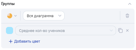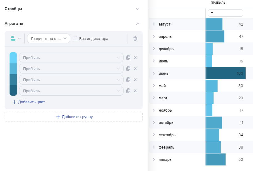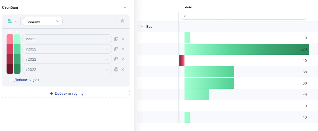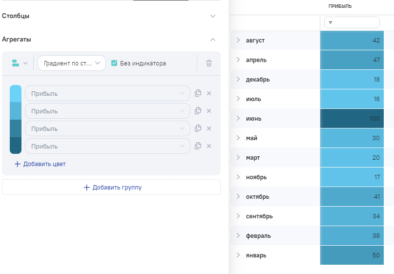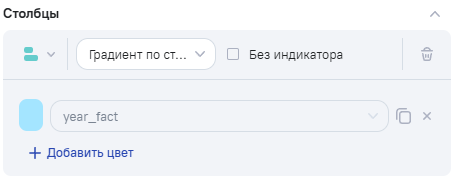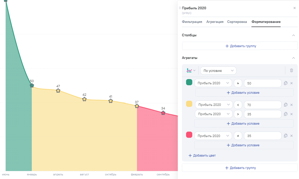 Для блока Агрегаты раскраска столбца/отрезка будет зависеть от условия, под которое попадает значение группы. Если задано несколько условий цвета, то значок показателя примет мультицвет. Для выбора доступны поля, по которым задана промежуточная агрегация.