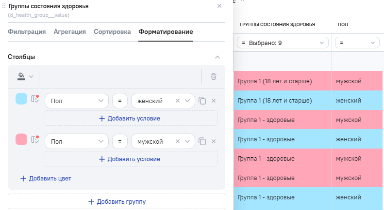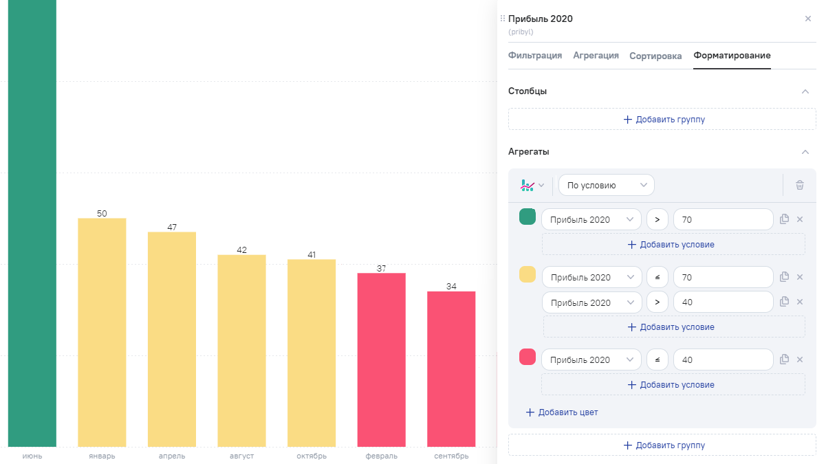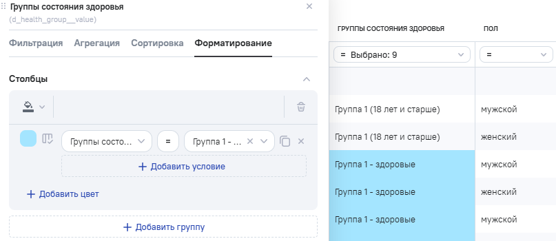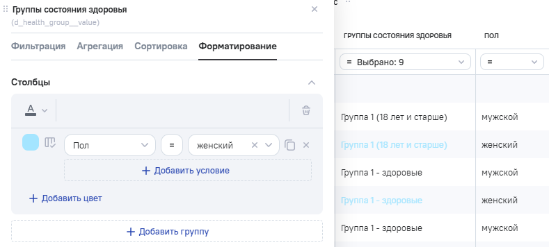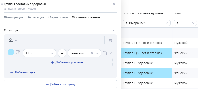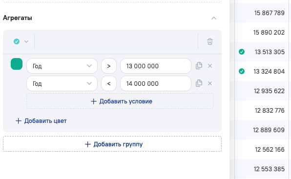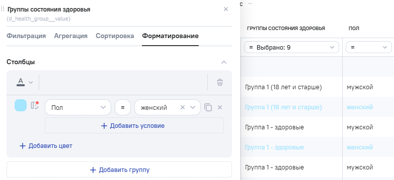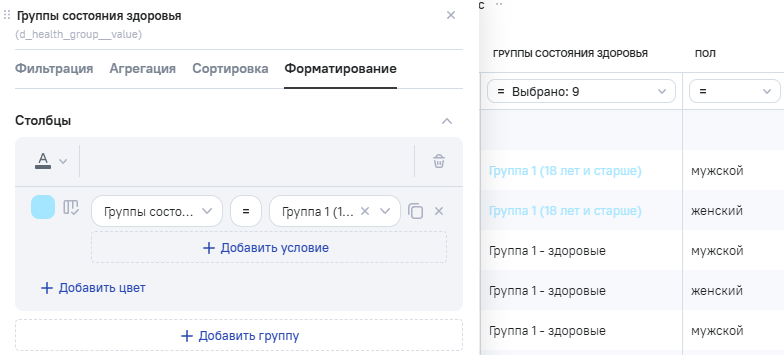 - выберите цвет и укажите условие. Строки/Агрегации/Группы по текущему полю, которые удовлетворяют условию(ям), будут залиты выбранным цветом;