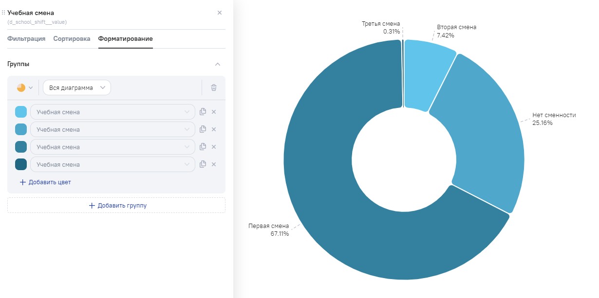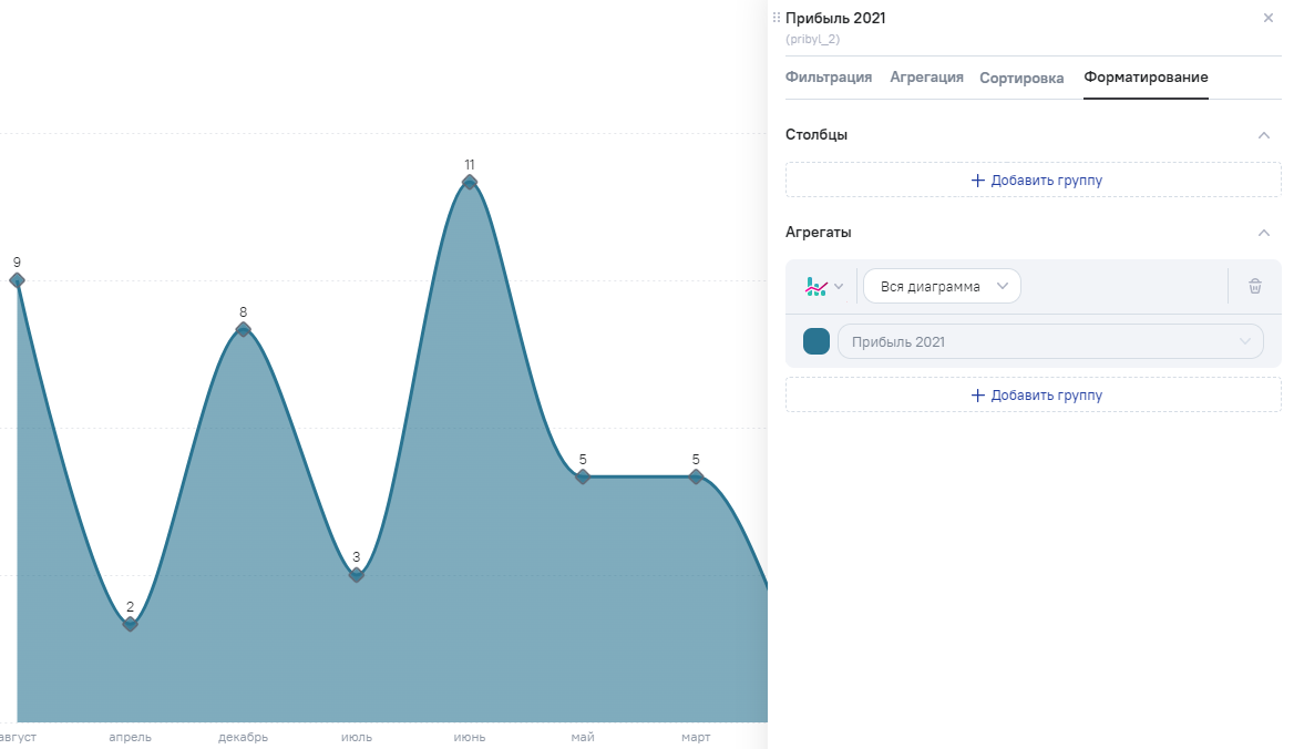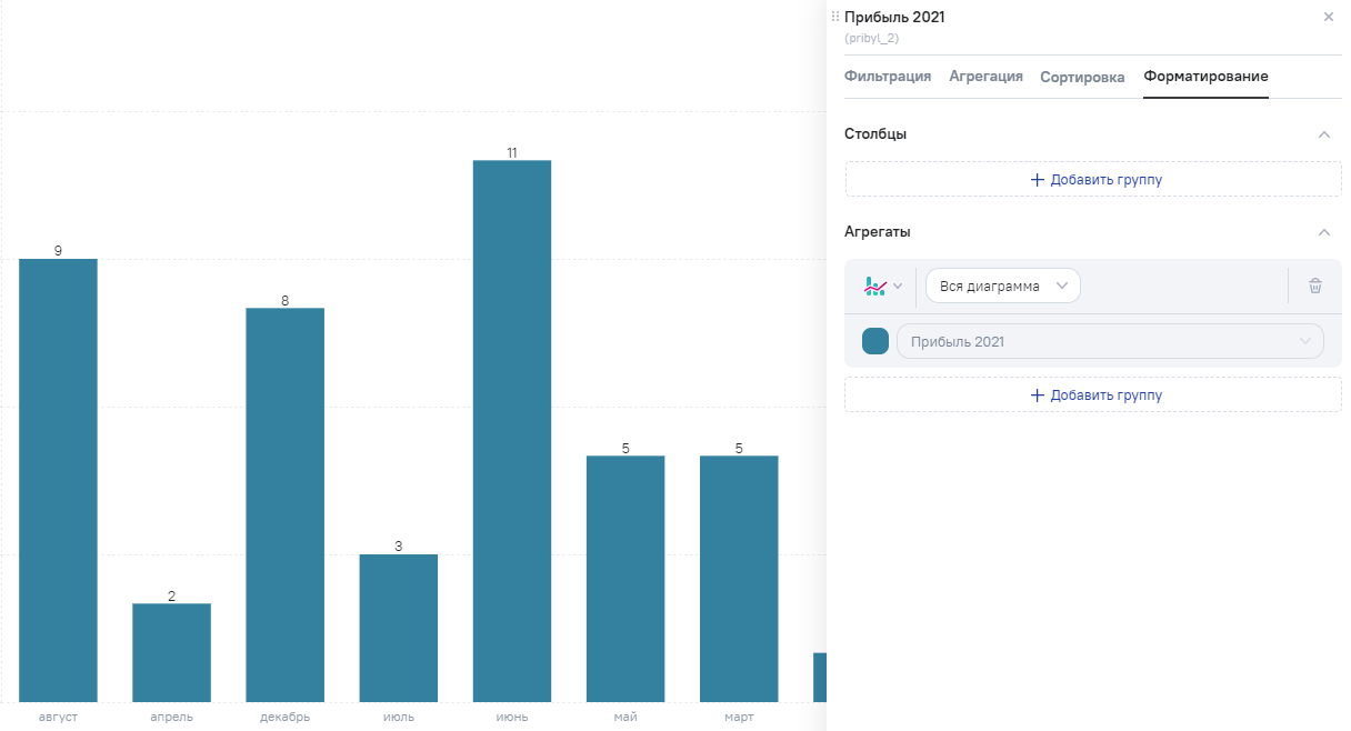 Форматирование диаграммой для полей-групп применяется для окраски секторов круговой диаграммы. Для полей с промежуточной агрегацией применяется для окраски столбчатой диаграммы, линейного графика и некоторых других типов графических виджетов.