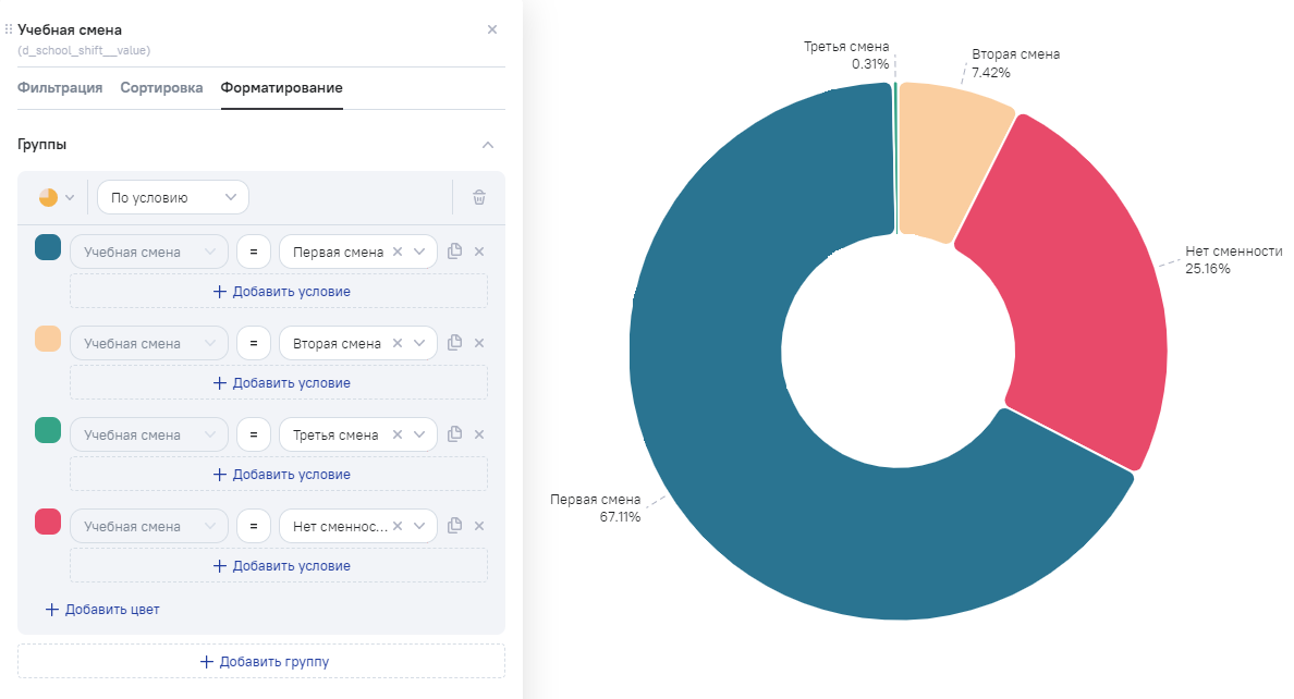 Добавьте несколько цветов по кнопке Добавить условие. Выбранные цвета распределяются последовательно по секторам круговой диаграммы.