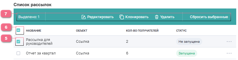 7.Панель для выполнения действий над выбранными рассылками - появляется при выборе одной или нескольких рассылок. Содержит: