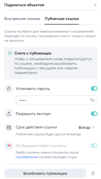 Разрешить экспорт - для доступности функционала по экспорту (pdf и png) объекта по прямой ссылке;