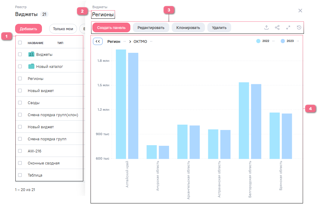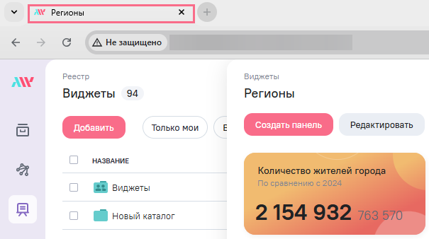 Создать панель - для перехода от виджетов к работе с информационными панелями - создания новой информационной панели на базе данного виджета. Кнопка отображается в интерфейсе, если у пользователя или группы есть доступ к системной группе Просмотр панелей;