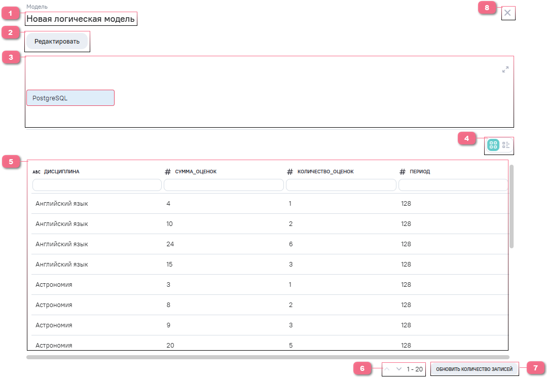 6.Панель с информацией о количестве строк данных в модели. Итоговые данные модели, определяются ее структурой. Данные модели доступны к предпросмотру в карточке модели, отображаются 20 строк (если строк в модели меньше 20, то отображаются все строки).