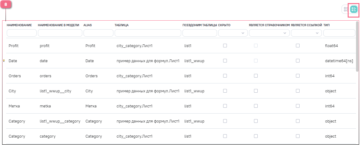 5.Данные модели – содержит структуру полученной таблицы (названия столбцов и их типы) и данные. Также для каждого столбца предусмотрено поле фильтра, обеспечивающее поиск по данным модели.