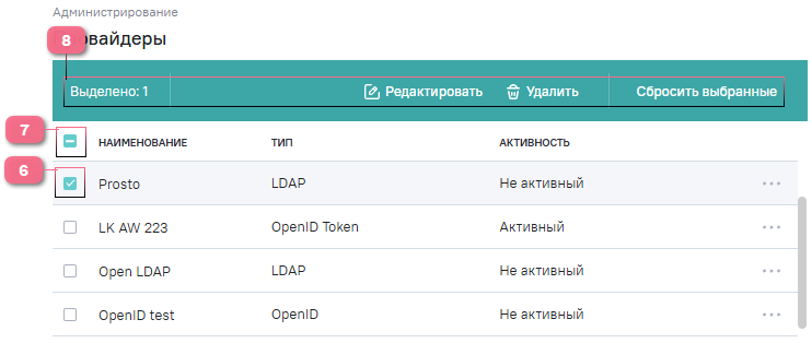 8.Панель для выполнения действий над выбранными провайдерами - появляется при выборе одного или нескольких провайдеров. Содержит следующие элементы: