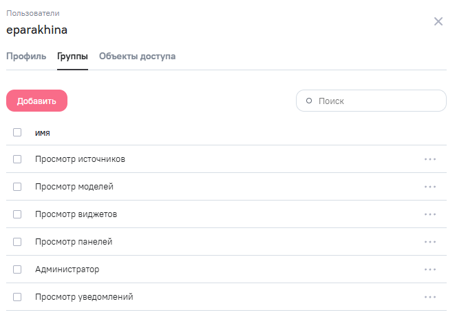 Добавить. В открывшемся окне доступен список системных и пользовательских групп с возможностью выбора. Ранее добавленные группы в списке отобразятся с установленным