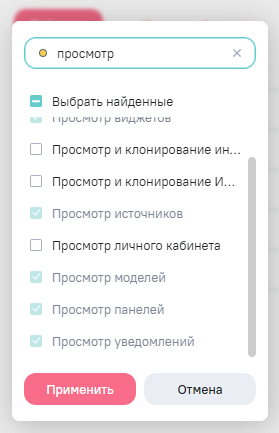 флагом и будут недоступны для повторного выбора. В строке поиска начните вводить название группы, отобразятся группы согласно параметрам поиска. При нажатии на кнопку Выбрать найденные выбираются только отфильтрованные элементы списка. Нажмите на кнопку