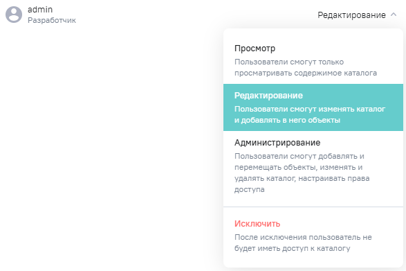 - право Редактирование - пользователи могут просматривать, изменять каталог и добавлять в него объекты;