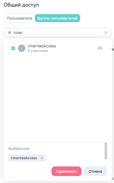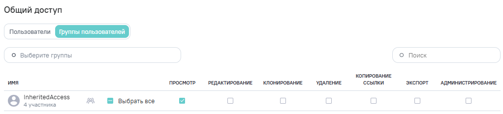 Для предоставления прав группам пользователей выберите пункт Общий доступ и на вкладке Группы пользователей нажмите на поле Выберите группы. Отобразится список пользовательских групп Системы, начните вводить наименование группы, список будет отфильтрован по заданному критерию. Чтобы выбрать группы пользователей, установите флажки напротив них. Все отмеченные группы отобразятся в блоке Выбранные.