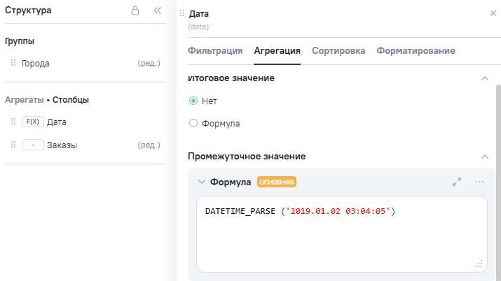 2.В Расчетные агрегаты добавлен новый агрегат Date (дата), в Промежутоное значение указана формула DATETIME_PARSE('2019.01.02 03:04:05').