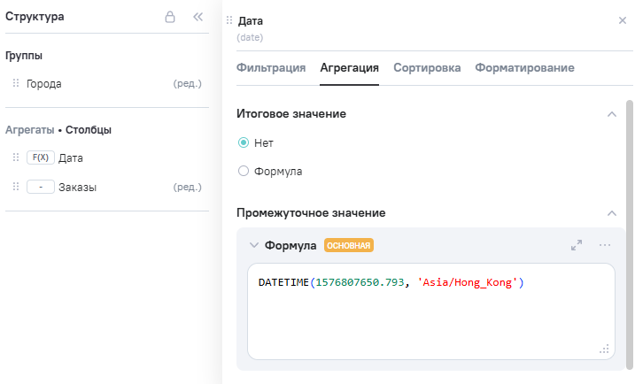 2.В Расчетные агрегаты добавлен новый агрегат Date (дата), в Промежутоное значение указана формула DATETIME(1576807650.793, 'Asia/Hong_Kong').