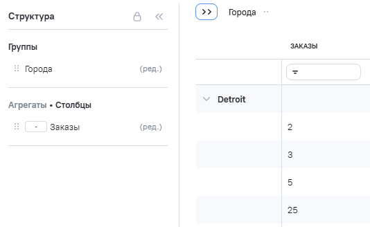 1.В виджете на вкладке Данные поле City (город) определено как Группы, поле Orders (заказы) определено как Столбцы.