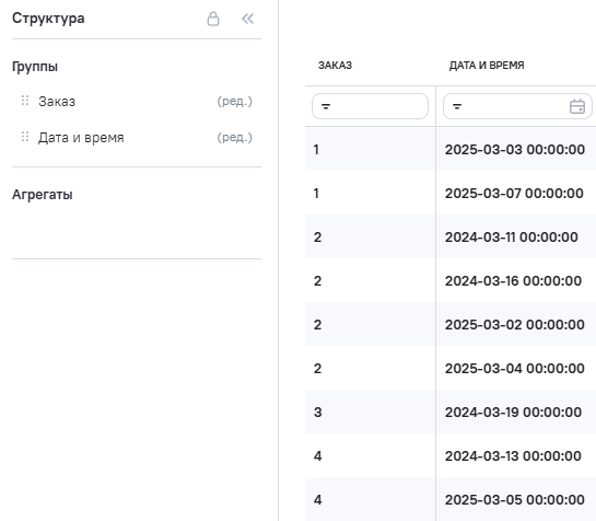 2.На вкладке Данные поля Orders (заказ) и Date (дата и время) определены как Группы.