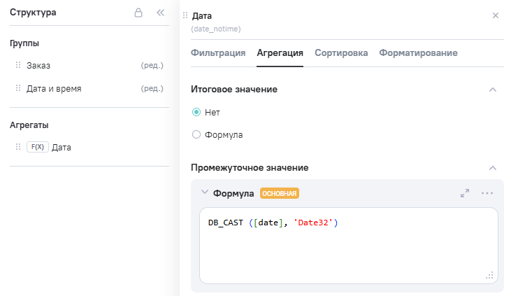 3.В Расчетные агрегаты добавлен новый агрегат Date_notime (дата), в Промежутоное значение указана формула DB_CAST([date], 'Date32').