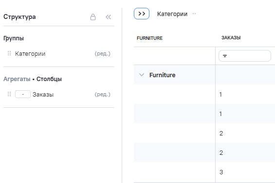 1.В виджете на вкладке Данные поле Category (категории) определено как Группы, поле Orders (заказы) определено как Столбцы.