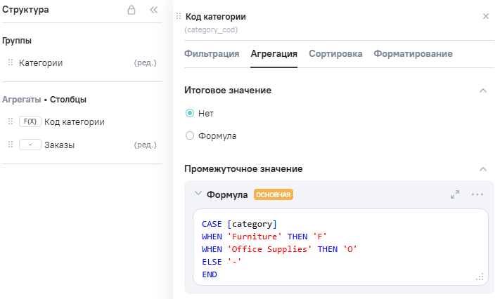 2.В Расчетные агрегаты добавлен новый агрегат Category_cod (код категории), в Промежутоное значение указана формула CASE [category] WHEN 'Furniture' THEN 'F' WHEN 'Office Supplies' THEN 'O' ELSE '-' END.