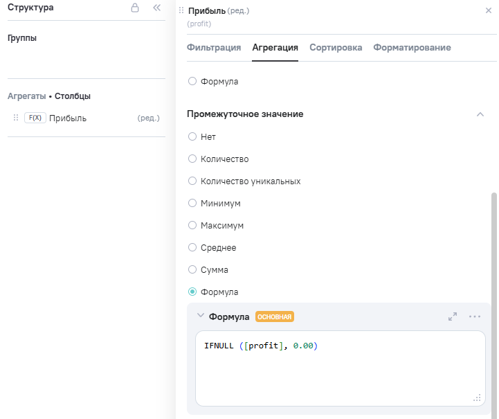 2.В Расчетные агрегаты добавлен новый агрегат Profit_orders (прибыль по заказу), в Промежутоное значение указана формула ZN ([profit]/[orders]).