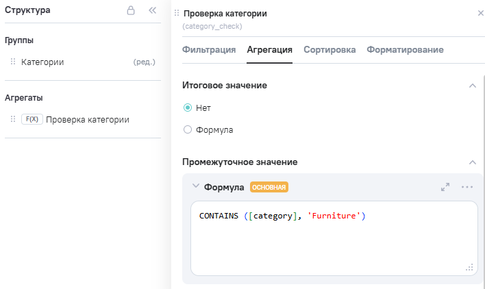 3.В Расчетные агрегаты добавлен новый агрегат Category_check (проверка категории), в Промежутоное значение указана формула ICONTAINS ([category], 'furniture').