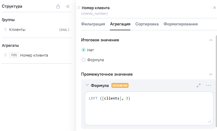 3.В Расчетные агрегаты добавлен новый агрегат Clients_number (номер клиента), в Промежутоное значение указана формула LEFT ([clients], 3).