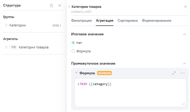 3.В Расчетные агрегаты добавлен новый агрегат Category_edit (категории товаров), в Промежутоное значение указана формула LTRIM ([category]).