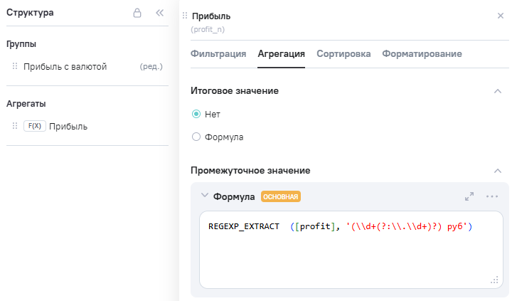 Profit_n (прибыль), в Промежутоное значение указана формула REGEXP_EXTRACT ([profit], '(\\d+(?:\\.\\d+)?) руб')(1).