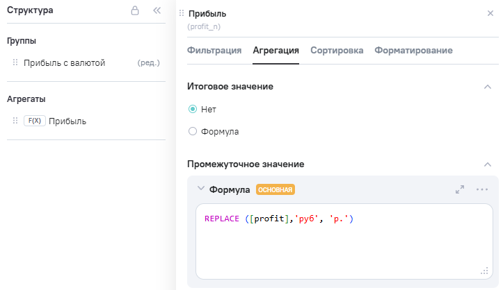 3.В Расчетные агрегаты добавлен новый агрегат Profit_n (прибыль), в Промежутоное значение указана формула REPLACE ([profit], 'руб','р.').