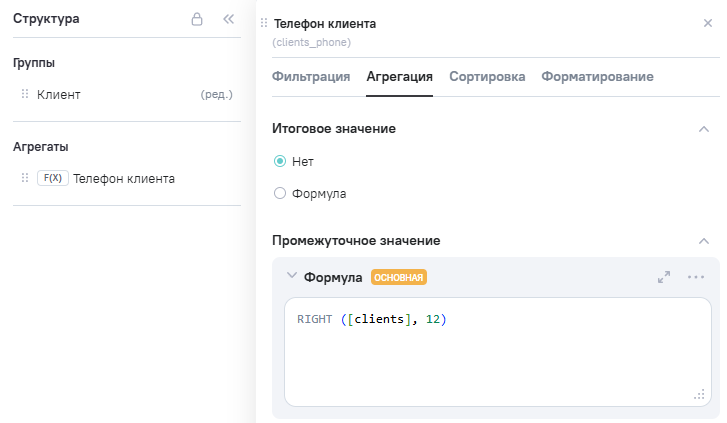 3.В Расчетные агрегаты добавлен новый агрегат Clients_phone (телефон клиента), в Промежутоное значение указана формула RIGHT ([clients], 12).