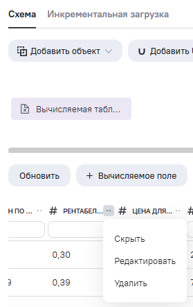 Чтобы клонировать ранее созданное вычисляемое поле в режиме редактирования модели в левой части окна в блоке Вычисляемые поля наведите курсор мыши на наименование необходимого вычисляемого поля и нажмите на кнопку . В открывшемся выпадающем списке выберите значение Клонировать.
