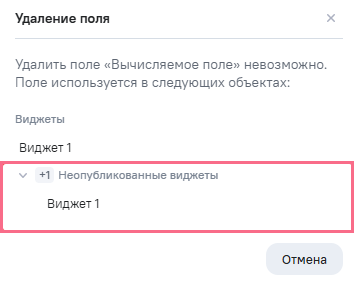Если вычисляемое поле используется в виджете или поле выбрано для создания системного виджета в информационной панели, то при удалении поля открывается уведомление о невозможности выполнения действия. В уведомлении отображается список связанных объектов.