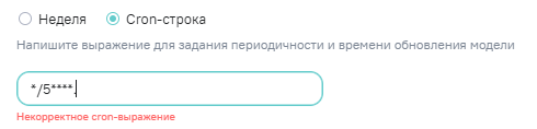 Cron-строка- можно реализовать более сложные режимы обновления, преодолевающие описанные ограничения за счет прямого ввода cron-строки. Строка вводится в формате файла linux CRONTAB в соответствии с принятыми правилами ее написания. При вводе cron-выражения под полем ввода отобразится описание настроенного расписания. В случае ввода некорректного cron-выражения под полем ввода отобразится подсказка красного цвета - Некорректное cron-выражение. При сохранении некорректного выражения cron-строки отобразится уведомление об ошибке.