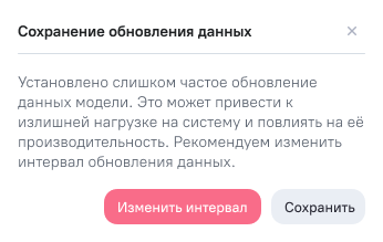 При попытке задать обновление модели с интервалом менее 5 минут, система отображает предупреждение после нажатия на кнопку