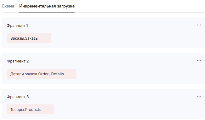 - отображается напротив каждого фрагмента. Содержит пункт Настройка для перехода в окно настроек инкрементальной загрузки данных по фрагменту.